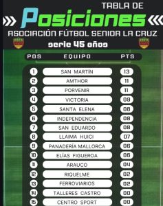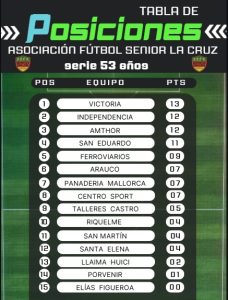 El pasado sábado 18 de abril, en cuatro campos deportivos de la ciudad, se disputó una nueva jornada por el Campeonato Oficial organizado por la Asociación de Fútbol Senior de La Cruz, y tras los resultados que se produjeron en ambas categorías, la tabla de posiciones respectivas quedaron de la siguiente manera